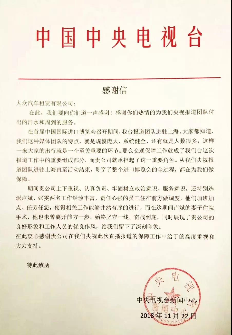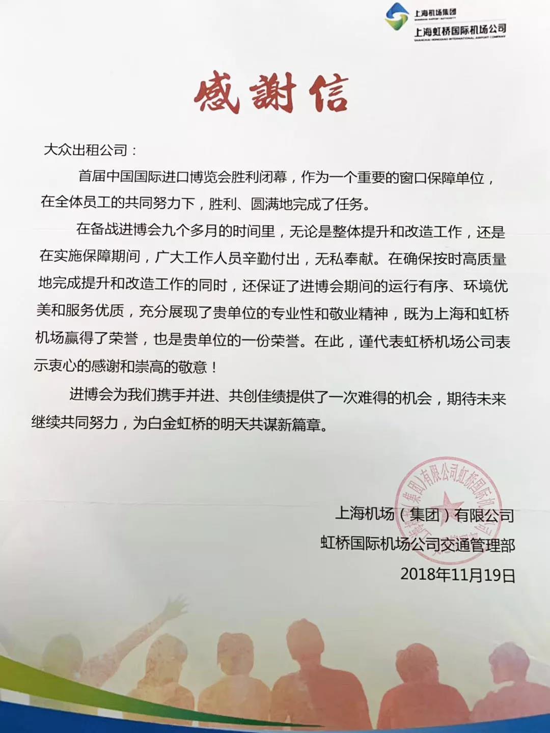 j9九游会出租租赁继收到上海市政府新闻办表彰信后,近日又收到中央电视台新闻中心、上海机场集团有限公司发来的感谢信,对j9九游会在进博会期间提供的优质出行服务表达诚挚的谢意。