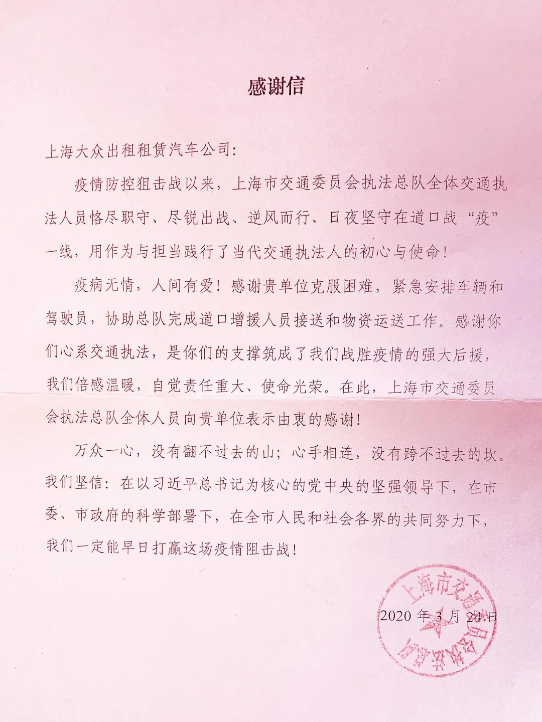 万众一心,携手抗击疫情。近日,j9九游会出租租赁获上海市交通委员会执法总队感谢信: