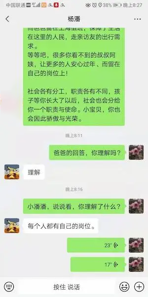 “警察叔叔在马路上巡逻值班,保障春节期间交通顺畅。环卫阿姨在马路上清洁作业,保障春节期间城市容貌整洁。医生阿姨在医院里值班,保证春节期间人民健康安全。而爸爸留在上海值班,保障了生活在这里的人民,走亲访友的出行需求。等等吧,很多你看不到的叔叔阿姨,让更多的人安心过年、而留在自己的岗位上!社会各有分工,职责各有不同,孩子等你长大了以后,社会也会分给你一个职责与使命。小宝贝,你也会因此骄傲与光荣。”记者看到,面对自己儿子的提问,杨宁宁在微信里如是回复。他还询问儿子:“爸爸的回答,你理解吗?”儿子马上回复:“理解。”杨宁宁进一步循循善诱:“小潘潘,说说看,你理解了什么?”儿子回答道:“每个人都有自己的岗位。”
